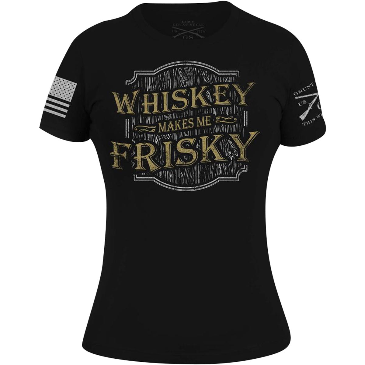 The Grunt Style Women's Whiskey Makes Me Frisky T-Shirt is crafted with 100% combed ring-spun cotton for soft, all-day comfort and wear. It features a tagless, itch-free design and ribbed collar that won't lose its shape. There's no better way to show your American pride than sporting your favorite shirt from Grunt Style.