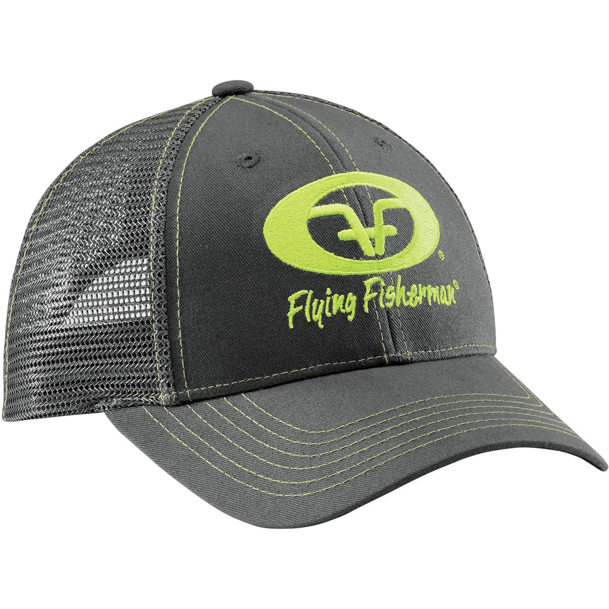 The Flying Fisherman Graphite Logo Trucker Hat has that classic mesh back look with an adjustable snap back closure. It features a curved bill with contrast stitching and non-glare under visor. The neon logo is front and center and also has a logo tag on the back. One size fits most.