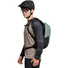Ready for a spontaneous mountain biking excursion? The Trailvent 15-liter bike backpack is your ideal companion. Not only does it feature an excellently ventilated Aeroflex 3D suspension, but it also ensures long-lasting comfort with its adjustable back length, well-padded hip and shoulder straps, and chest strap with hydration tube holder. With a well-designed compartment layout, it offers ample storage options: the large main compartment includes a separate section for a hydration bladder, a zip pocket for valuables, and a key holder. The spacious front pocket easily accommodates a pump, tools, and spare tube. Side compression straps toward the top keep the contents of the pack secure, while the mesh outer pockets provide quick access to essentials. Complete with a helmet holder, light holder, large reflective elements, and an integrated rain cover, this bike backpack is equipped for any adventure. Plus, its Eco Finish ensures PFC-free water repellency. The VAUDE Green Shape label stands for environmentally-friendly, functional products made from sustainable materials.