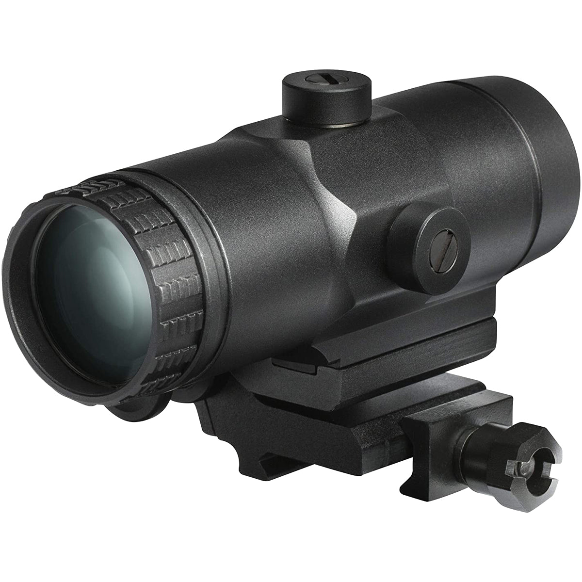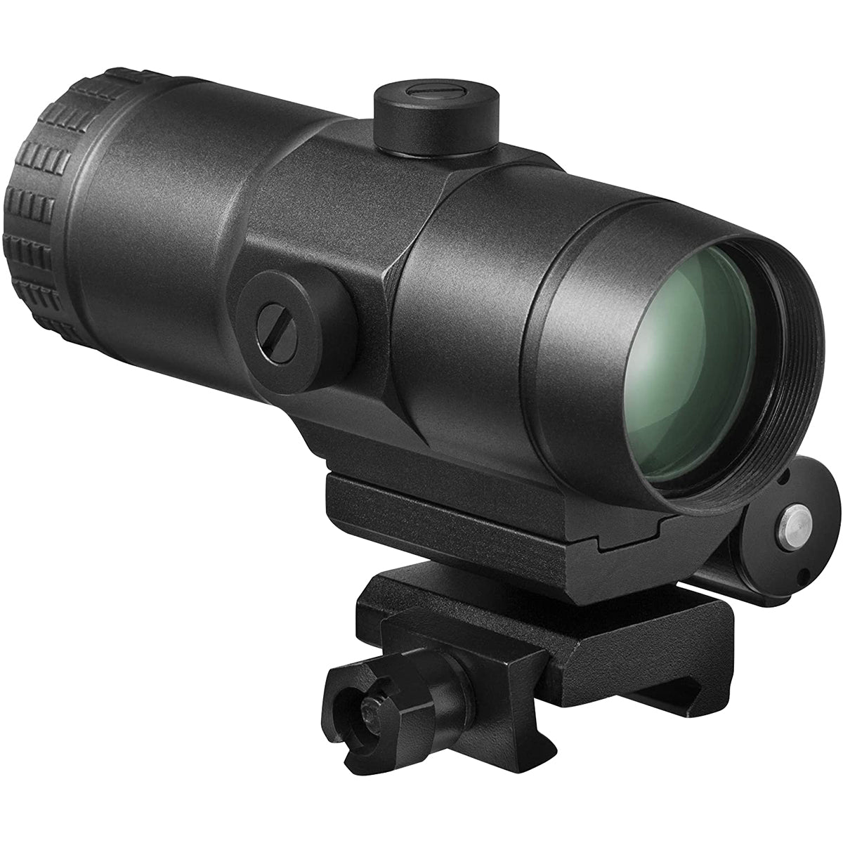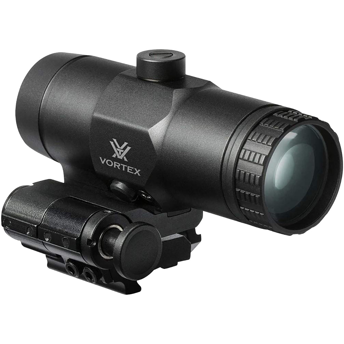 The Vortex Optics VMX-3T Magnifier is simple, fast, and effective. The push-button design of the VMX-3T engages and disengages the flip-mount, allowing the magnifier to lock in place. The result is 3x magnified or unmagnified views at will. Optics are fully multi-coated for optimal light transmission. The lightweight yet tough, hard-coat-anodized machined-aluminum construction ensures durability. It is internally nitrogen purged for reliable waterproof and fog-proof performance. It offers ultimate magnified versatility for virtually any AR-height red dot sight. The VMX-3T Magnifier will work with any of Vortex Optics' red dots but it is not recommended for use with the prism scopes. It allows for lower 1/3 or absolute co-witness mounting heights and is ideal for shooters who want to increase the effective range of their red dot sight.