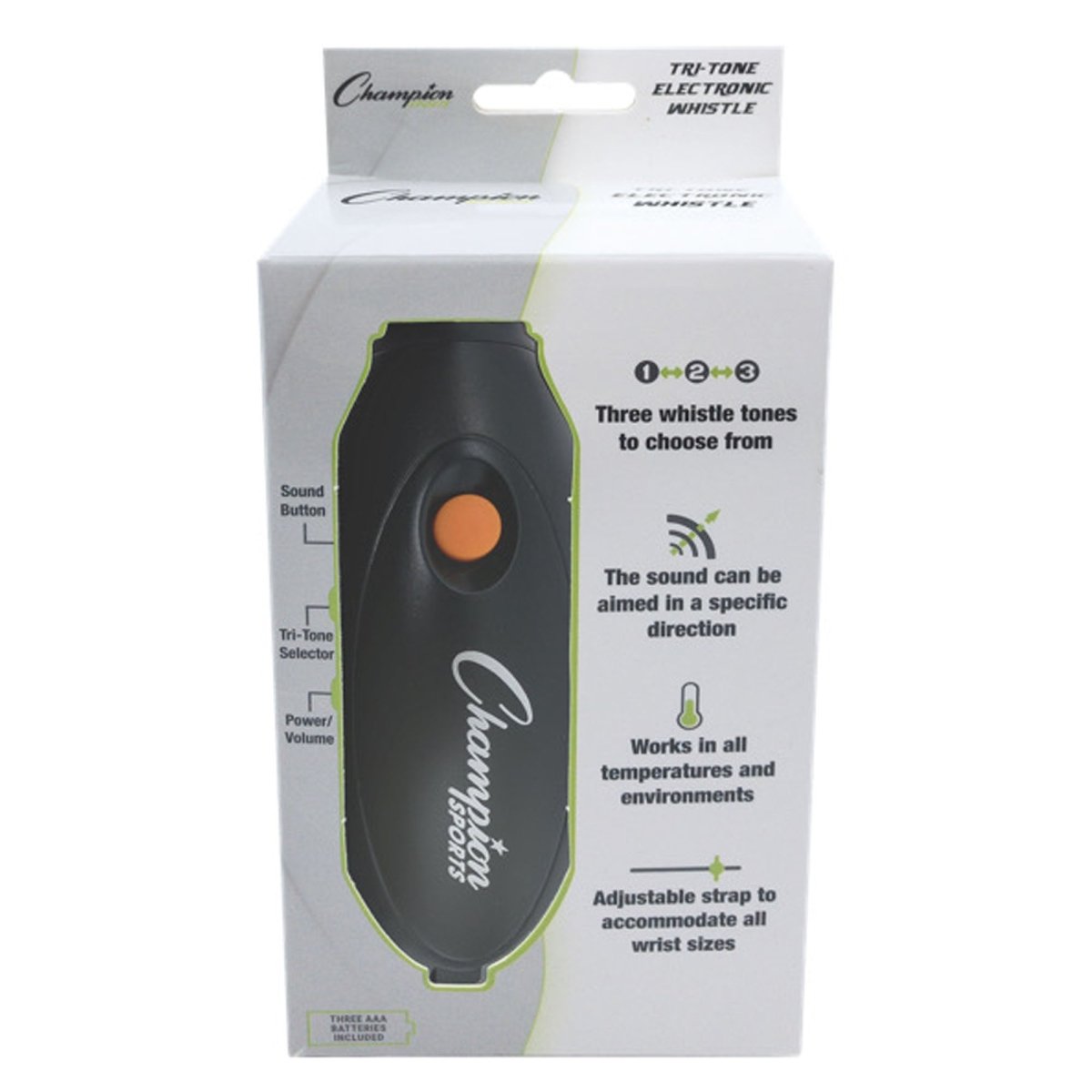 Great for referees, coaches, lifeguards, trainers, police, personal use and more. The Champion Sports Electronic Hand Whistle makes it easy to distinguish between different alerts for your needs. The combination power and volume switch easily slides to the desired position. Attach the included wrist strap to the whistle for easy retrieval while on the go.