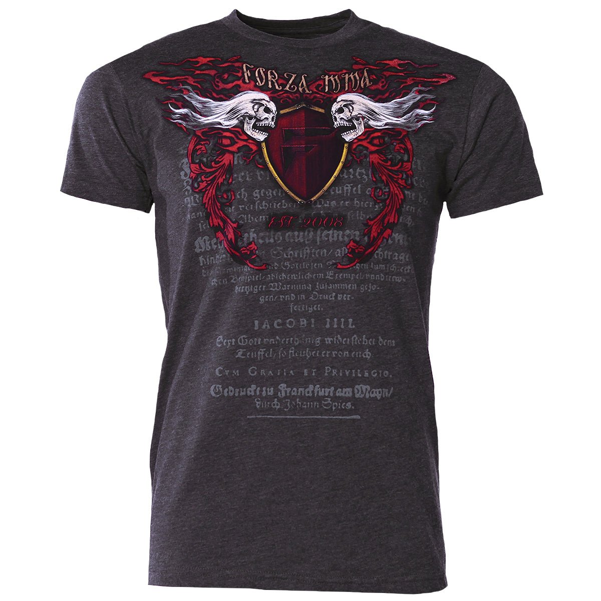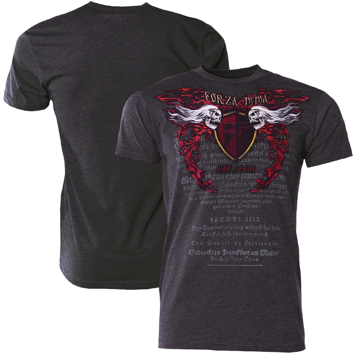 - The front of the shirt displays "Forza MMA" at the top with skulls and filigree all around the Forza Crest and "Est. 2008" at the bottom