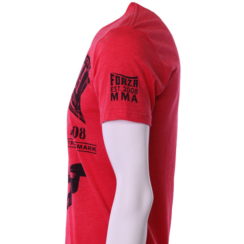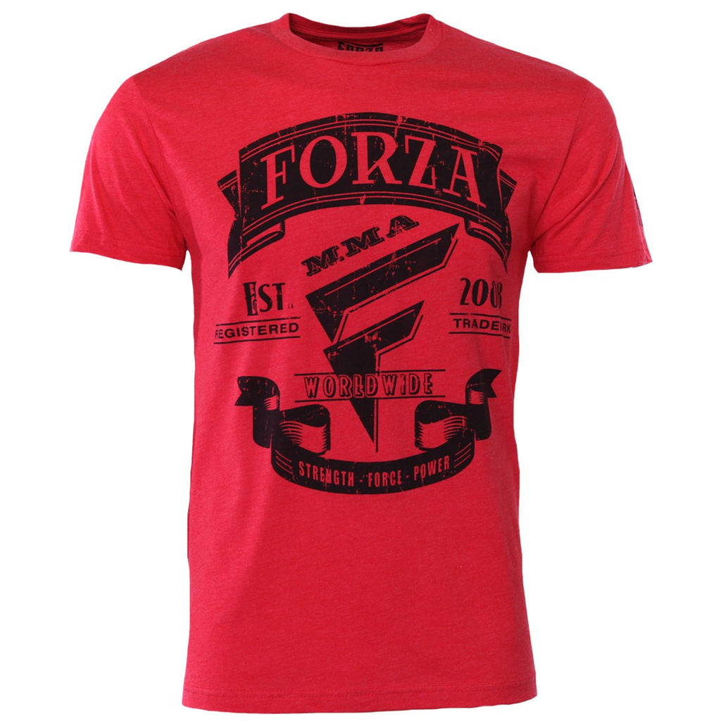 - The front of the shirt displays "Forza MMA" at the top and "Est. Registered" with "2008 Trademark" next to the monogram and "Worldwide" through it