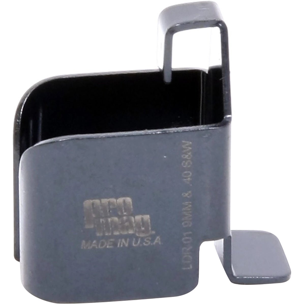 A pistol magazine loader for 9mm & .40 S&W double stack magazines with top dimensions of 1-3/8" x 7/8" and smaller. It is constructed of carbon steel with a black oxide finish. Made in the USA.